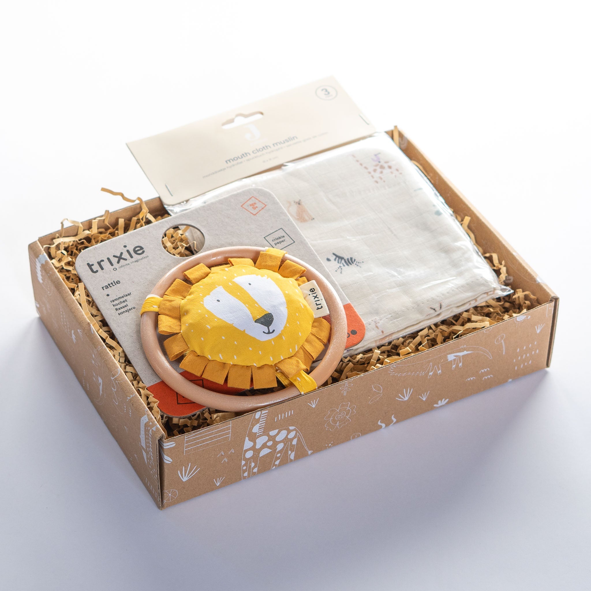 Jungle Joy brengt avontuur in elke speeldag! De Trixie Mr. Lion rammelaar zorgt voor vrolijke geluidjes en stimuleert het grijpen en ontdekken, terwijl de Jollein Jungle Jambo monddoekjes zachte, kleurrijke metgezellen zijn tijdens elk moment. Een vrolijk en attent cadeau voor jonge ontdekkers.