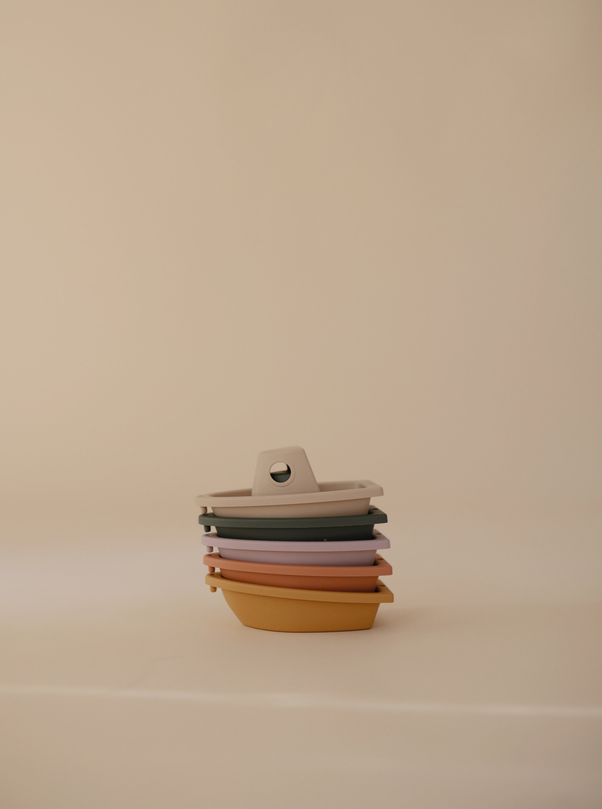 Bathtime is even more fun with this Mushie rustic bath boat set. The set consists of 5 stackable boats that float on the water and are easy to stack. Ideal for the bath or shower. The boats playfully stimulate your child's motor skills and imagination. Made in Denmark from safe and non-toxic plastic, free of BPA, PVC, and phthalates.