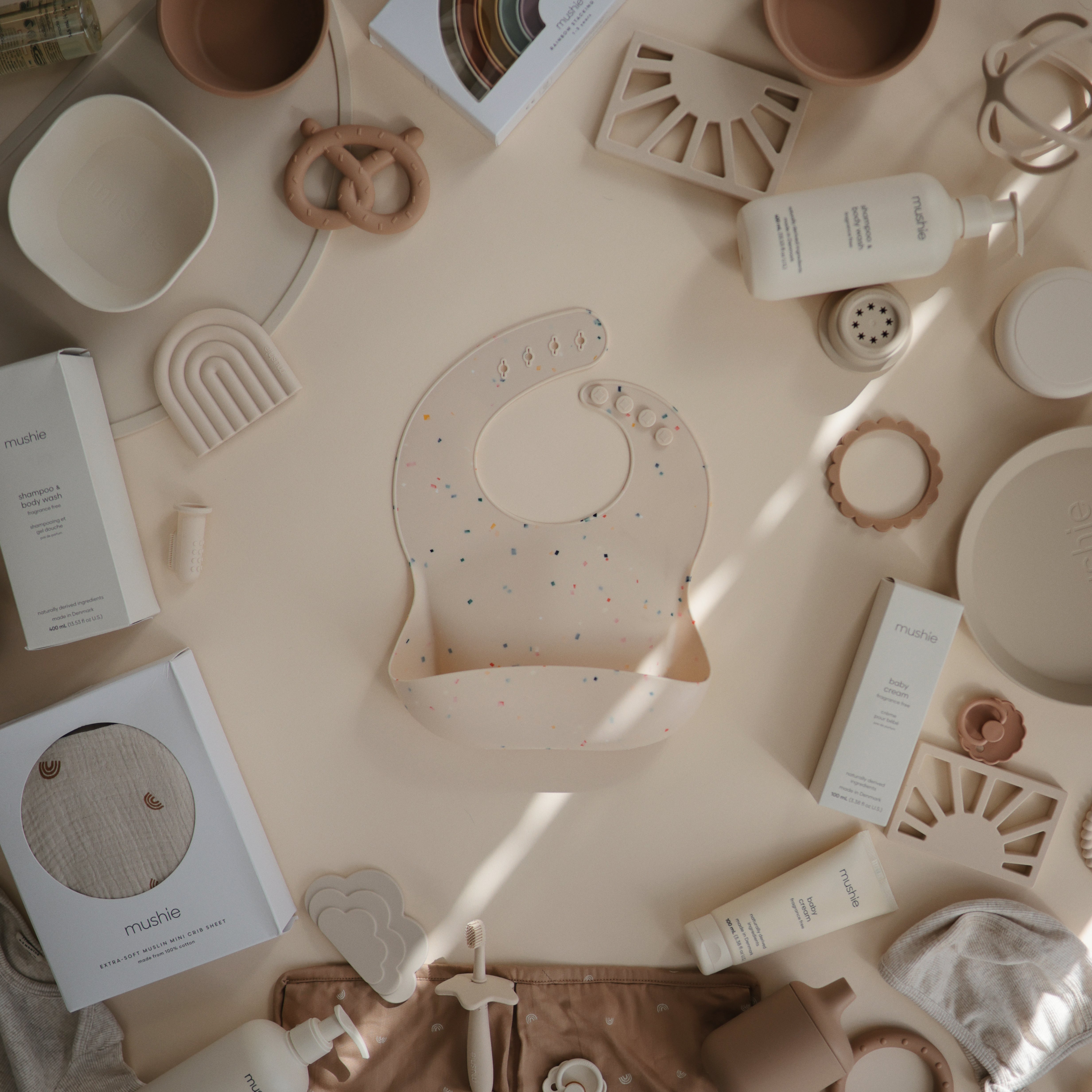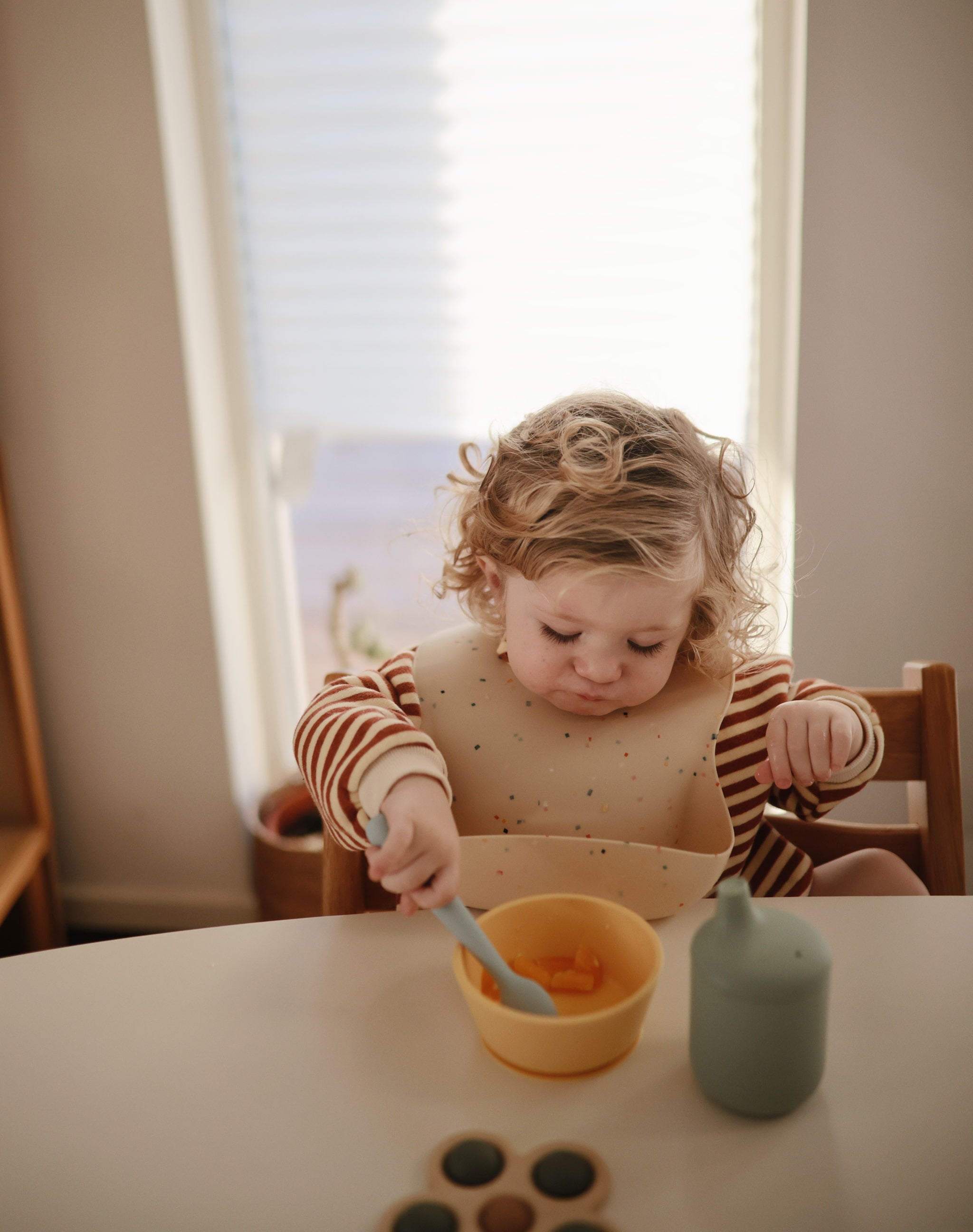 This cheerful silicone bib from Mushie in vanilla confetti makes mealtimes extra fun and clean. Thanks to the deep drip tray, the bib neatly catches all the crumbs. The soft silicone feels pleasant against the skin and is easily adjustable with snaps. After dinner, it's clean again in no time – just rinse or pop it in the dishwasher.