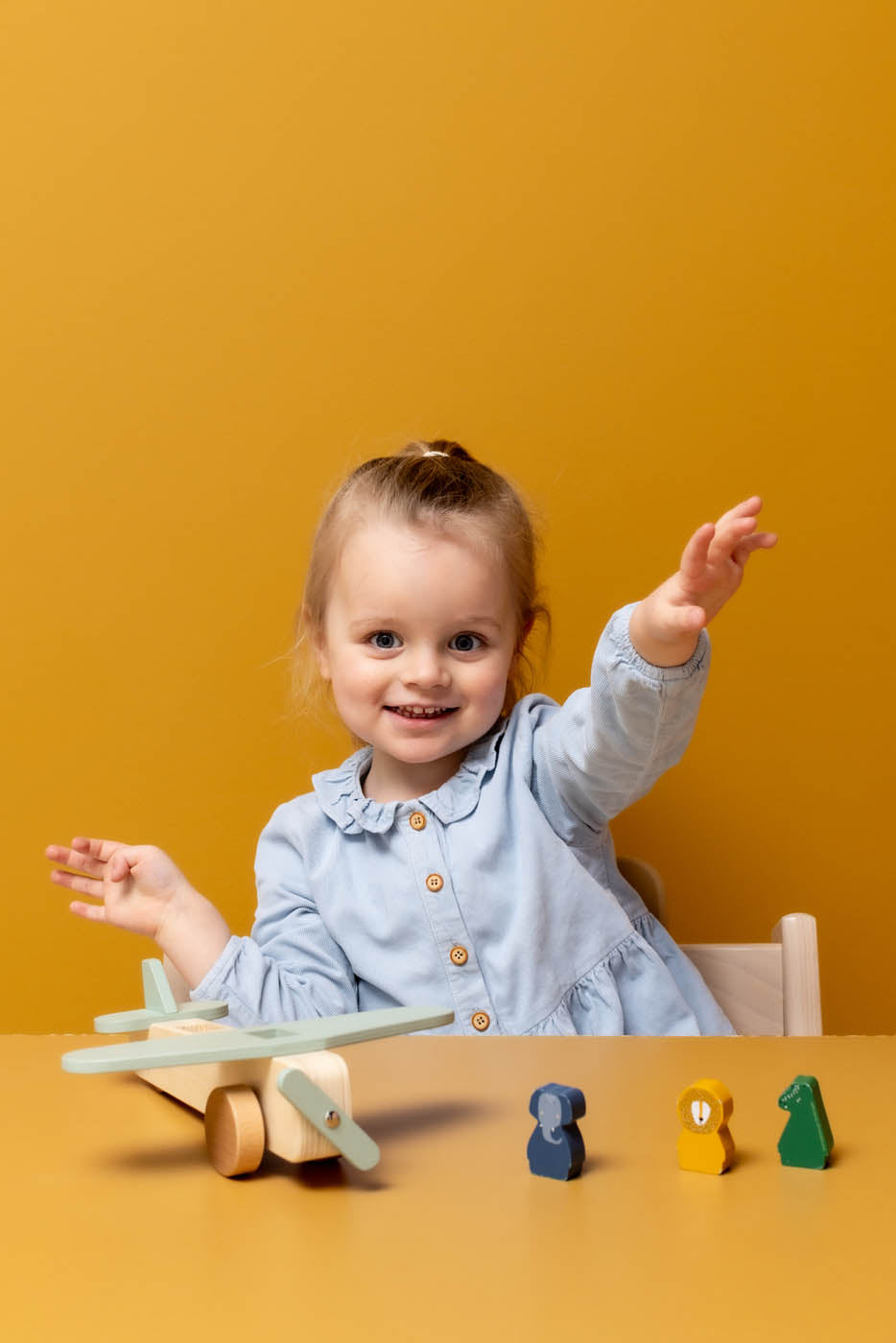 Ready for takeoff? The Trixie wooden animal plane is perfect for little pilots who love role-play. Mr. Crocodile and his two animal friends will take your little one on an adventure! Each figure fits in every seat, and the propeller spins. The front wheel and hidden rear wheel ensure smooth landings at any destination.